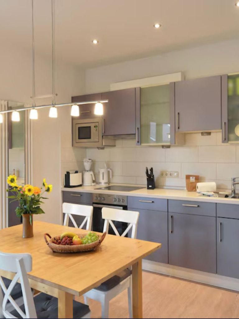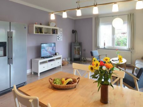 Die offene Wohn- und Essküche läd zum Verweilen ein. Die Küche ist vollausgestattet. Sie verfügt über einen Backofen mit Kochfeld, Wasserkocher, Toaster, Mikrowelle, Filterkaffeemaschine, Kühlkombi sowie eine Spülmaschine.