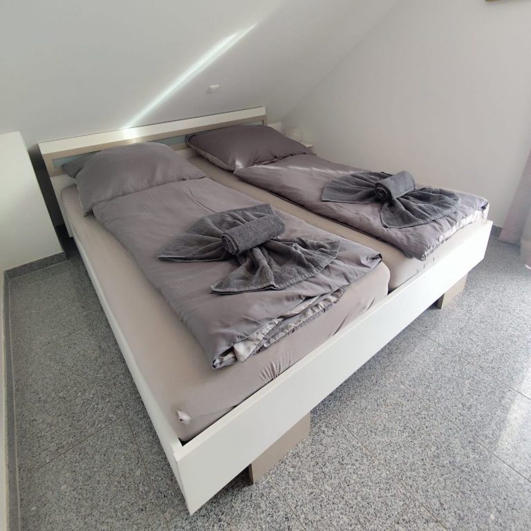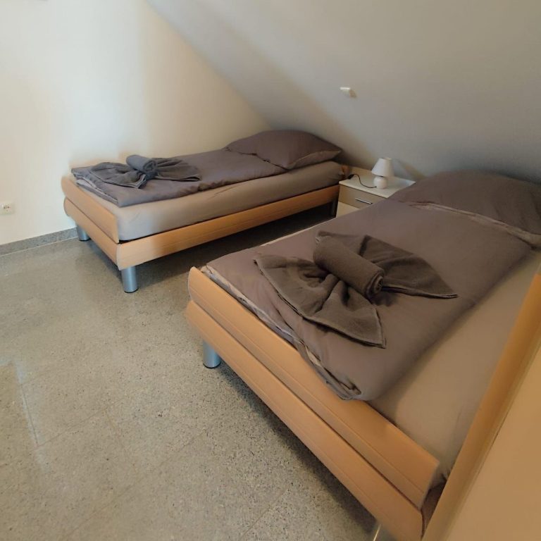 Für erholsame Nächte stehen Ihnen zwei Schlafzimmer zur Verfügung. Diese teilen sich auf in ein Zimmer mit Doppelbett, ein Zimmer mit zwei Einzelbetten sowie auf Anfrage ein Babyreisebett. Für genügend Stauraum sorgen die vorhandenen Kleiderschränke.